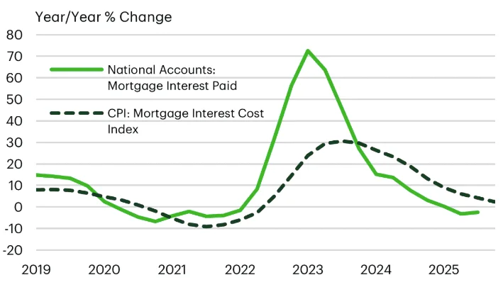 “The more plausible base case for MIC turning negative end of 2026-beginning of 2027, based on national accounts’ mortgage interest paid as a leading indicator,” she writes. “Deflation in MICs is unlikely to be dramatic, as interest rates are projected to stabilize well above pre-pandemic levels. But its directional signal is consistent with the broader story: the mortgage renewal headwind that has suppressed consumer spending for three years is losing force.”