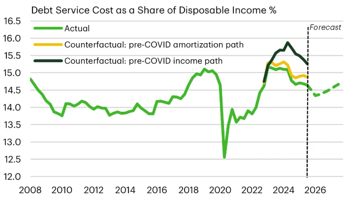 “The most telling sign that Canadian households have weathered the renewal shock is also the simplest: they are spending less of their income on debt. The debt service ratio for households is below its recent highs in 2023, suggesting the greatest strain on consumers has already passed,” writes Solovieva.