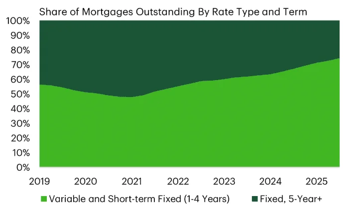 It also matters that there is now a larger share of variable-rate, variable payment mortgages, which are more interest rate sensitive than five-year fixed, at a ratio of 73 to 27. In 2022, the ratio was 55 to 45, and in 2024, it was 66 to 34.