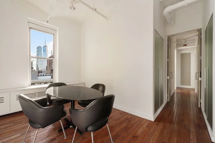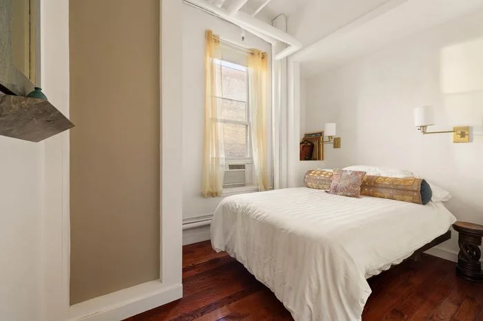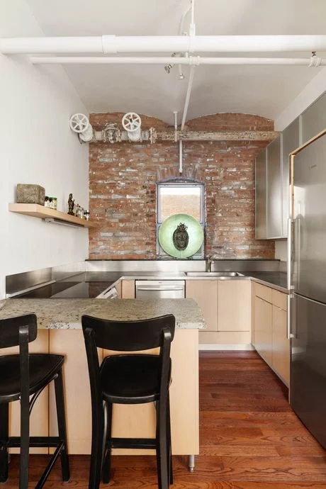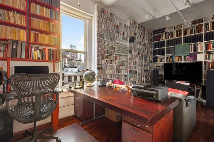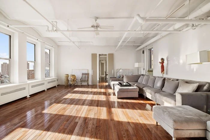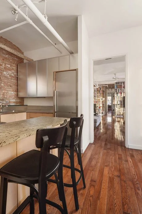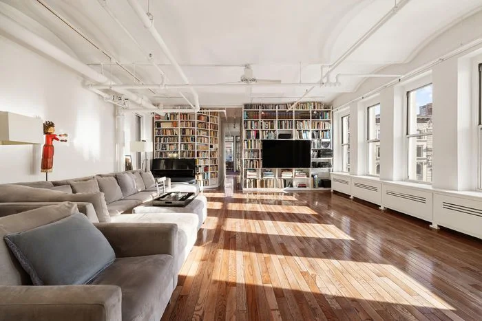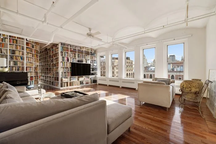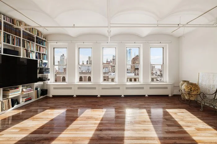 Rockwell and his filmmaker wife, Linda Mevorach, moved to the top-floor apartment in 1978, according to their broker, Gavin Shiminski, who listed the space for $4.5 million this week. The price accounts for a rarity in Soho: 22 windows across three exposures, with endless views, thanks to how the ten-floor building sticks out of the historic neighborhood. Other charms include exposed brick, high-barrel vaulted ceilings, old hardwood, and built-ins that stretch along a hall off the main, open living area.