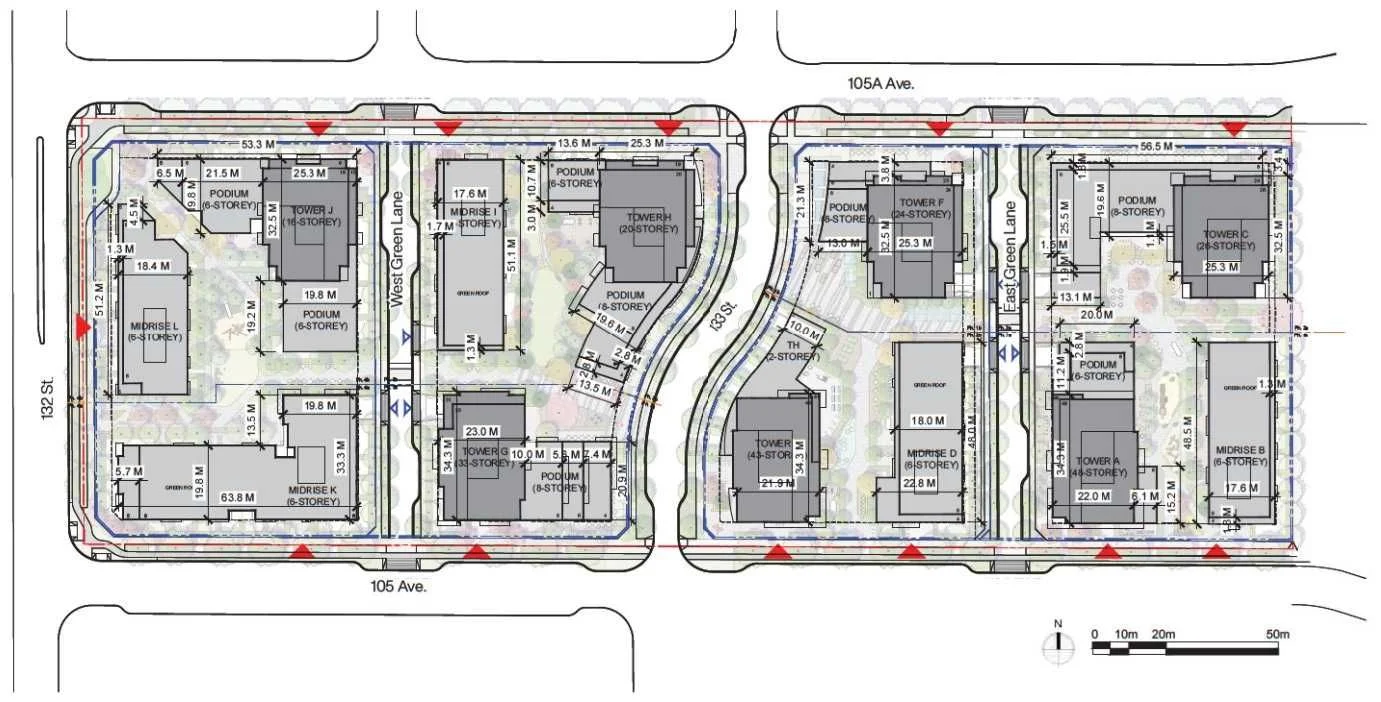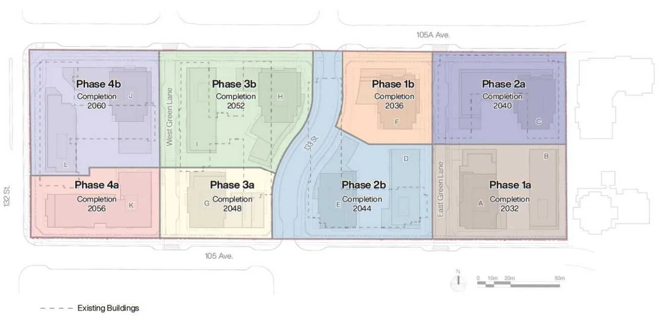 The existing 133 Street that runs along Whalley Athletic Park would be extended through — and roughly bisect — the site, with the first four phases making up the eastern half of the site, and latter four phases making up the western half of the site.